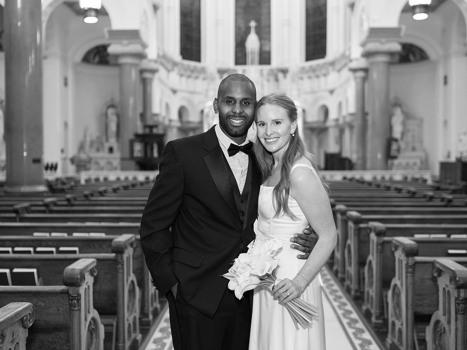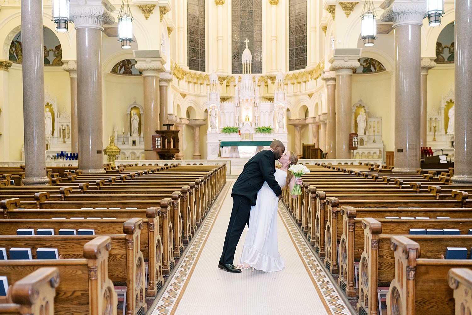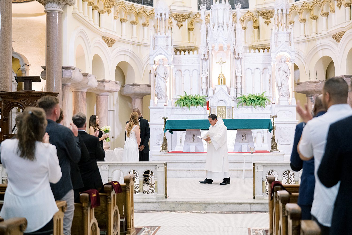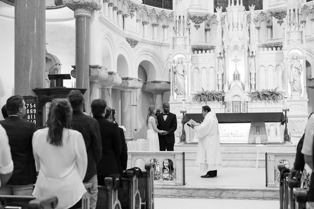 Jessica radiated happiness as she walked down the aisle holding a simple white bouquet, in her classic, flowy white gown. After meeting Michael at the altar, they had a beautiful catholic wedding ceremony before exiting as husband and wife, again. Their wedding photos capture all the grandeur of the space, highlighting the breathtaking architecture both inside and out.
